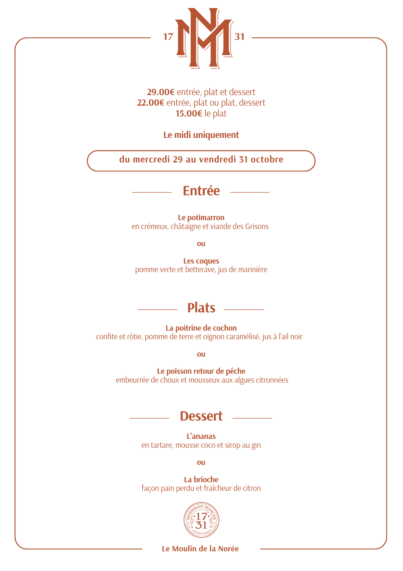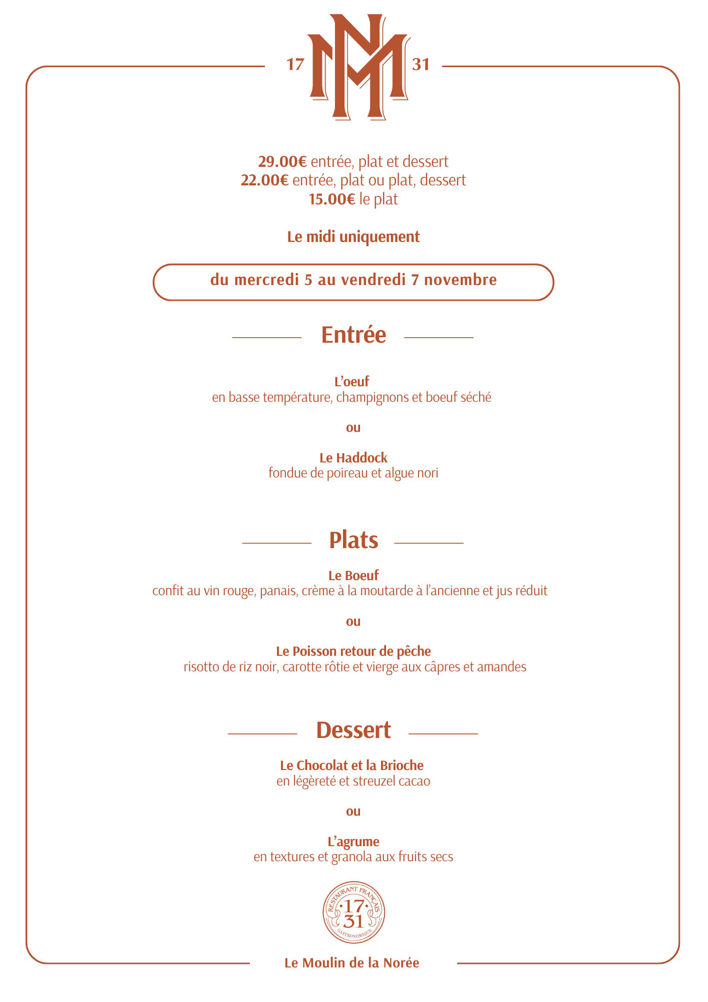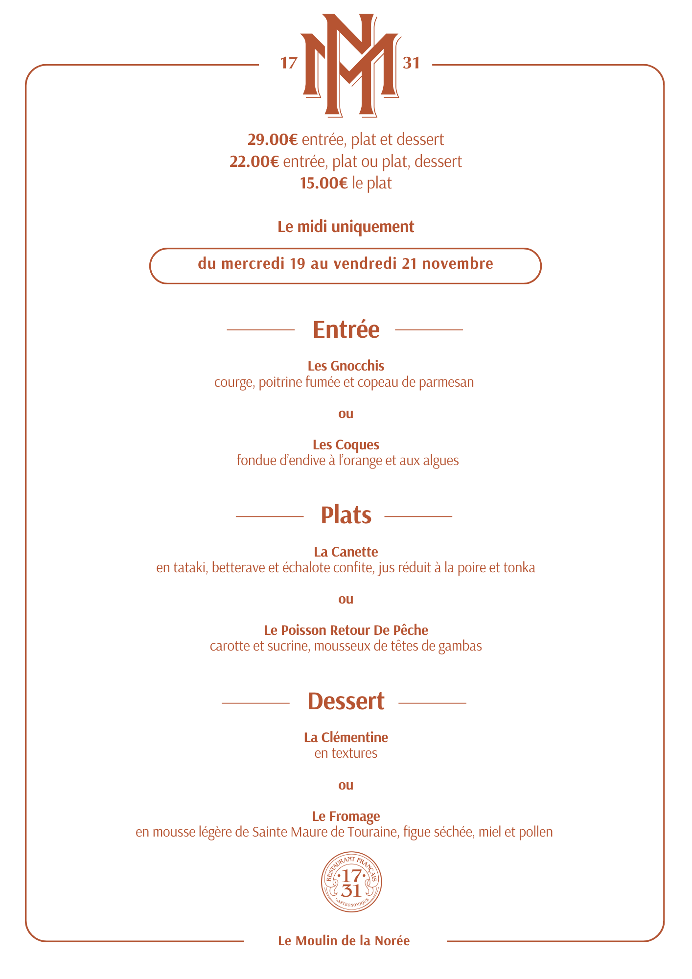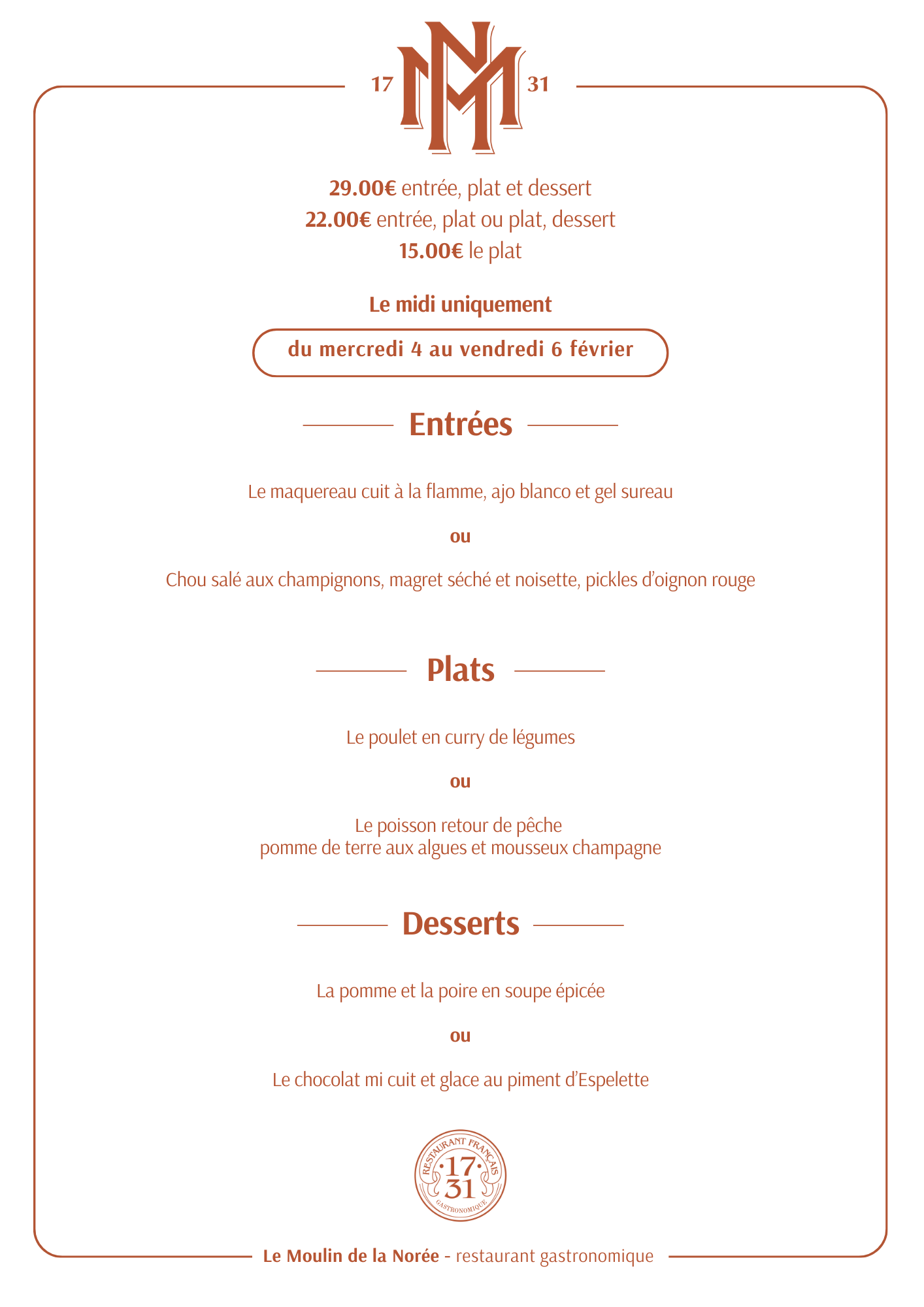 Formule de la semaine du Moulin de la Norée